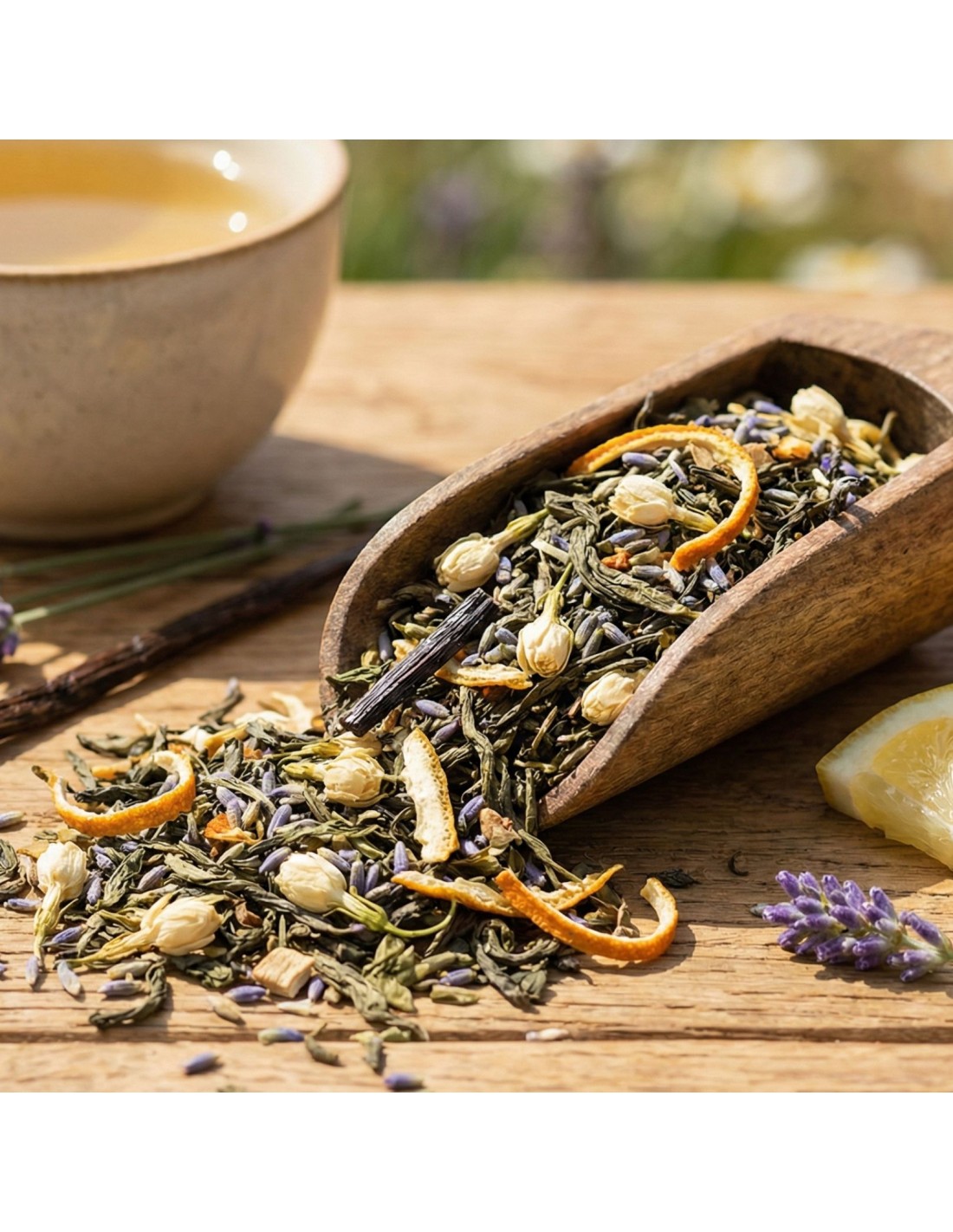 Embora seja um chá verde (portanto, contendo teína), a presença da lavanda torna-o uma bebida particularmente apaziguante. É o chá ideal para acalmar o ritmo a meio da tarde.