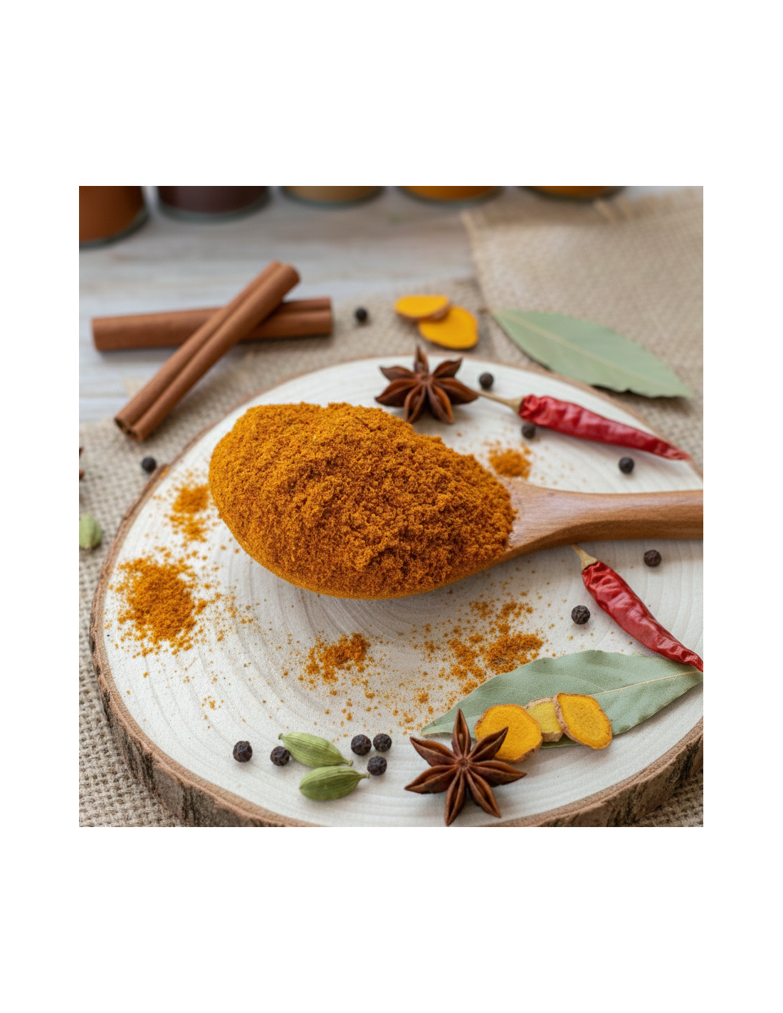 Uma mistura nobre: cardamomo, noz-moscada, canela, gengibre, cravo-da-índia, botões de rosa e muito mais.