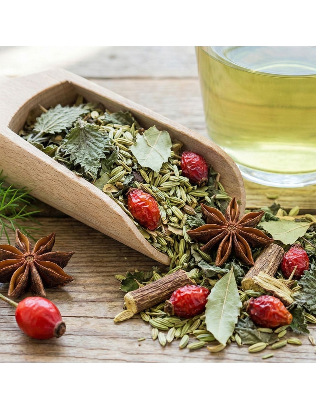 • Fennel & Green Anise: Partners for a flat stomach, they fight bloating. Gustatorily, they offer a warm and naturally sweet note that totally masks the potential bitterness of the birch.